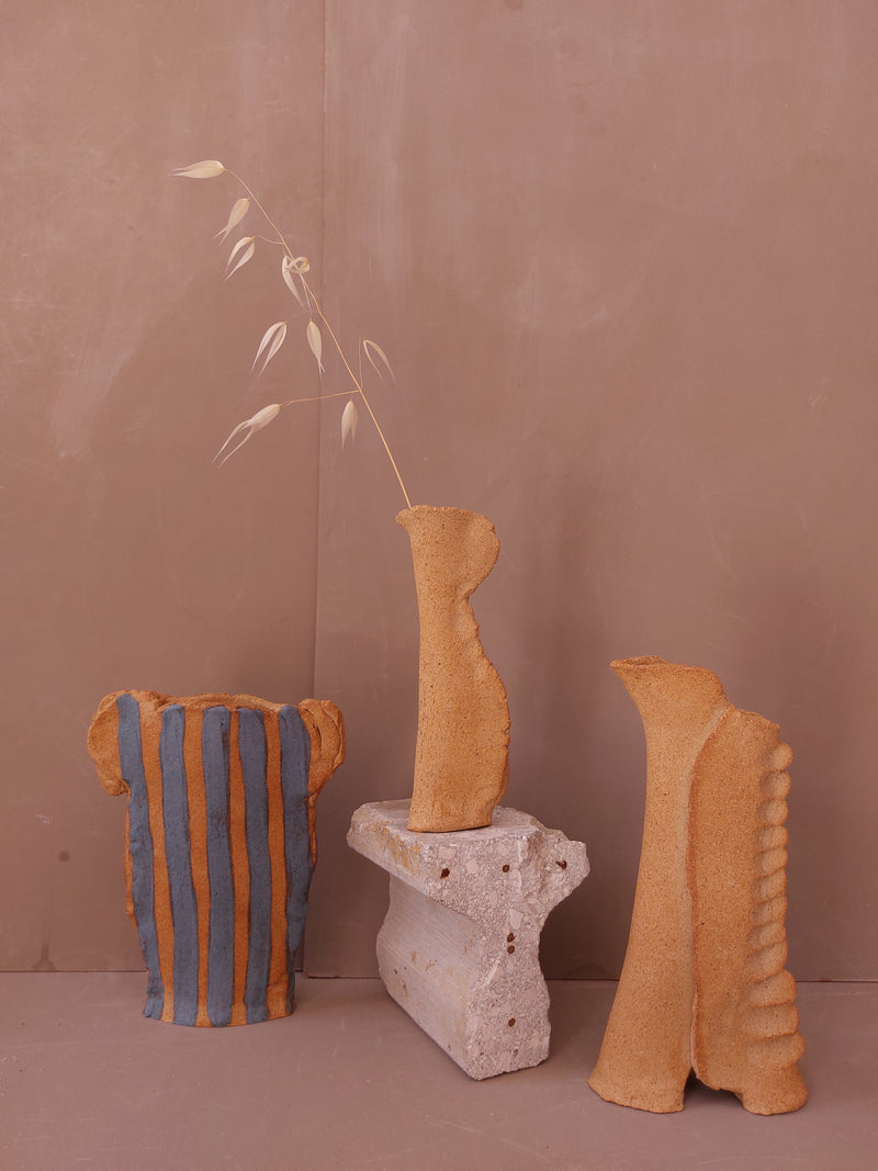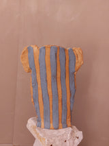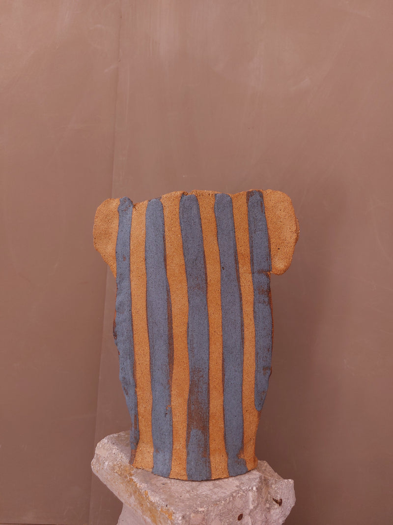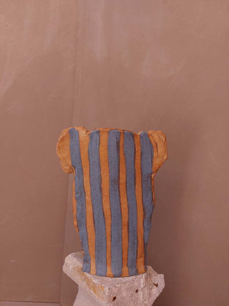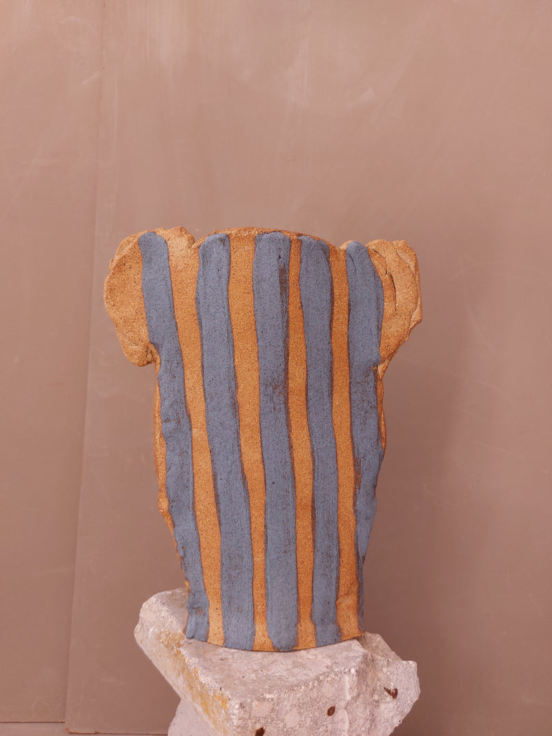 stoneware terracotta vase, blue stripes, unglazed | h. 23 cm, w. 19 cm.
